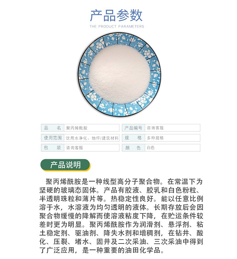 造紙助劑:在造紙工業(yè)中可用作紙張干強(qiáng)劑 助留劑 ,能極大的提高紙張質(zhì)量 節(jié)約成本,提高造紙廠的生產(chǎn)能力?梢灾苯优c無機(jī)鹽離子,纖維以及其它有機(jī)高分子發(fā)生靜電橋梁作用以達(dá)到增強(qiáng)紙張的物理強(qiáng)度,減少纖維或填料的流失。加快濾水 起到了增強(qiáng) 助留 助濾的作用,同時(shí)在脫模過程中起到了明顯的絮凝效果。